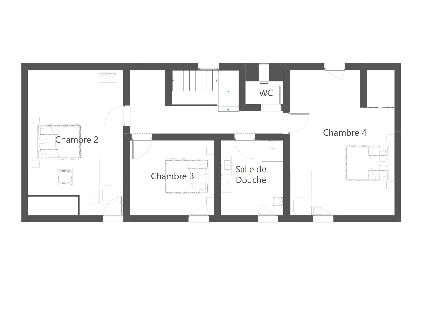 Im ersten Stock führt ein Korridor zu 2 großen Dreibettzimmern, einem Doppelzimmer, einem Duschraum und einer Toilette. Die alten Balken sind erhalten geblieben und geben dieser 132 m² großen Gîte ihren Charme.